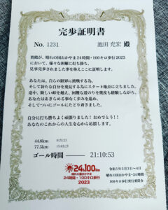 初めて参加したときは、フルマラソンもしてるし、歩きだから余裕じゃろ~と気楽に参加しましたが、とんでもない地獄を見てしまいました(笑)60kmくらいで体が動かなくなり、最後は足をひこずりながらのゴールで、その後3日間ほどはまともに歩けませんでした。本当に肉体的にも精神的にもきつかったです。