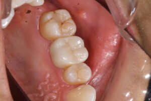 ジルコニアは透明になるほど脆くなる性質があったので、従来歯科で使われていたジルコニアは、ただ単に白いだけで、ものすごく硬く、扱いづらい材料だったのですが、最近透明感と硬さを兼ね備えた材料に進化しつつあります。そして、ステイン無しというのは、汚れをつけないということです。ステインをわざとつけることで、横の歯とほぼ同じ色にすることが可能ですが、その分加工費用もかかるため、今回はあまり見えない部分なので、少し節約させてもらいました。